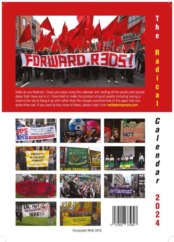 This is an A4 calendar with spiral hook. Inside you will find 12 photographs from the many demos we have been to. Also you will find various quotes and important dates and to top it off there is room for notes too.